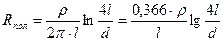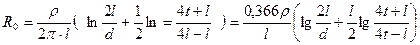 где ρ – удельное сопротивление грунта, Омм; l – длина заземлителя (проволоки, полосы, трубы), м; d – диаметр заземлителя, м (l >> d); t – глубина заложения, м; t0 > 0,5 м (рис. 8.14).