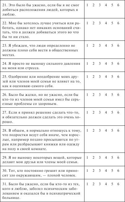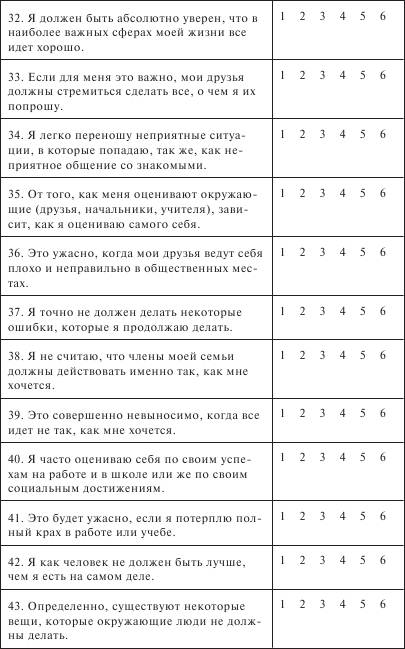 Проверьте, пожалуйста, ответили ли вы на все вопросы. Ключ По каждому типу установок подсчитывается суммарный балл соответственно ключу, если данный пункт отмечен буквой R, то шкала меняет значения на противоположные. Например, по шкале «катастрофизация» суммарный балл подсчитывается следующим образом: Пункт 1, 26, 46 значения по шкале 1 2 3 4 5 6 6 5 4 3 2 1 оценка Пункт 6, 11,16, 21,31, 36, 41 значения по шкале 1 2 3 4 5 6 1 2 3 4 5 6 оценка