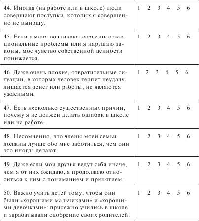 Методика А. Эллиса Методика А. Эллиса направлена на определение степени рациональности – иррациональности мышления, наличия и выраженности иррациональных установок. Вам предлагаются утверждения (50), с которыми вы можете соглашаться либо не соглашаться, а также промежуточные формы ответов. В данной методике 6 шкал, из них 4 шкалы – основные и соответствуют 4 группам иррациональных установок мышления, выделенным автором: «катастрофизация», «долженствование в отношении себя», «долженствование в отношении других» и «оценочная установка». Шкала «катастрофизация» отражает восприятие людьми различных неблагоприятных событий. Низкий балл по этой шкале свидетельствует о том, что человеку свойственно оценивать каждое неблагоприятное событие как ужасное и невыносимое, в то время как высокий балл говорит об обратном. Показатели шкал «долженствования в отношении себя» и «долженствования в отношении других» указывают на наличие либо отсутствие чрезмерно высоких требований к себе и другим. «Оценочная установка» показывает то, как человек оценивает себя и других. Наличие такой установки может свидетельствовать о том, что человеку свойственно оценивать не отдельные черты или поступки людей, а личность в целом. Другие две шкалы – оценка фрустрационной толерантности личности, которая отражает степень переносимости различных фрустраций (т. е. показывает уровень стрессоустойчивости) и общая оценка степени рациональности мышления. Полученные данные сверяются с ключом, затем высчитываются средние показатели. Чем выше балл, полученный по каждой шкале, тем рациональнее человек, и наоборот. У людей бывают разные убеждения. Нас интересует ваше мнение относительно утверждений, приведенных ниже. Пожалуйста, зачеркните или обведите в кружок цифру справа от каждого утверждения, которая наиболее соответствует вашему отношению к данному утверждению. полностью согласен – 1 в основном согласен – 2 слегка согласен – 3 слегка не согласен – 4 в основном не согласен – 5 полностью не согласен ‑6