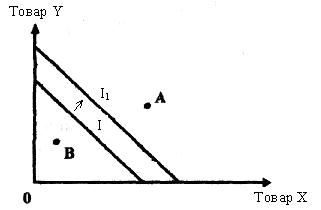Рисунок 5 Ограничением на покупаемые наборы из двух благ выступает количество денег у потребителя (бюджет). Бюджетная линия показывает различные наборы двух товаров, которые можно приобрести на фиксированное количество денег. Графическое изображение бюджетной линии (I и I1) представлено на рисунке 6. Уравнение бюджетной линии