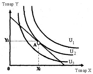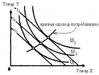 Рисунок 6. Бюджетная линия Потребитель стремится максимизировать полезность покупаемых товаров, при этом он должен учесть свои бюджетные возможности. Поэтому максимум полезности потребитель получит в точке касания кривой безразличия U и прямой бюджетного ограничения I. На рисунке 7–а это точка А. Оптимальный выбор потребителя – количество Х1 товара Х и количество Y1 товара Y. При имеющемся бюджетном ограничении наборы товаров кривой безразличия U1 недостижимы. А наборы товаров кривой безразличия U2 нерациональны. При росте дохода потребителя происходит сдвиг бюжетной прямой вправо, а также изменение объема и структуры потребления, которое ведет к перемещению на более высокую кривую безразличия (рисунок 7 -б). Если соединить все получающиеся точки касания прямой бюджетного ограничения и кривой безразличия (соответствующие оптимальному выбору потребителя в каждом случае), то можно получить некоторую ломаную линию, которая называется кривая «доход-потребление».