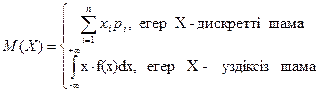 Шешуі: Дискретті кездейсоқ шаманың математикалық күтімі X- тің мүмкін мәндерінің ықтималдықтарына көбейтінділерінің қосындысына тең болады: