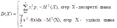 формуласымен анықталатын шаманы айтамыз. Дисперсияның төмендегідей қасиеттері бар: 1.D(C)=0; 2. D(CX)=C2 D(X); 3. D(X+Y)=D(X)+D(Y); 4. D(X)³0, бұл формулалардағы С - тұрақты шама; X,Y – кездейсоқ шамалар. Орта квадраттық ауытқудеп: s= формуласы бойынша есептелінетін шаманы айтамыз. Кездейсоқ шаманың моменттері: Х кездейсоқ шамасының k ретті алғашқы моменті nk деп