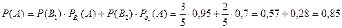 2.3 Толық ықтималдық формуласы және Бейес формуласы 2.3.1 - мысал Пирамидада 5 мылтық бар, олардың үшеуі оптикалық көздеуі бар мылтық. Мергеннің нысанаға оптикалық көздеуі бар мылтықпен тигізуі 0,95 –ке тең, оптикалық көздеуі жоқ мылтықпен нысанаға тигізу ықтималдығы 0,7 – ге тең. 1) Мергеннің кездейсоқ алынған мылтықпен нысанаға тигізу ықтималдығын табу керек; 2) Мергеннің нысанаға оптикалық көздеуі бар мылтықпен тигізу ықтималдығын табу керек; 3) Мергеннің нысанаға оптикалық көздеуі жоқ мылтықпен тигізу ықтималдығын табу керек. Шешуі: А- нысанаға оқ тигізілді деген оқиға болсын. Мылтық туралы екі гипотеза қарастырылады:
