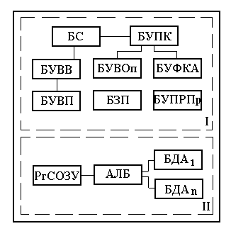 Рис. 2.3. Общая логическая структура микропроцессора: I - управляющая часть, II - операционная часть; БУПК - блок управления последовательно-стью команд; БУВОп - блок управления выполнением операций; БУФКА - блок управления формированием кодов адресов; БУВП - блок управления виртуальной памятью; БЗП - блок защиты памяти; БУПРПр - блок управления прерыванием работы процессора; БУВВ - блок управления вводом/выводом; РгСОЗУ - регистровое сверхоперативное запоминающее устройство; АЛБ - арифметико-логический блок; БДА - блок дополнительной арифметики; БС - блок синхронизации.