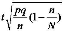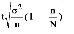 где Формулы предельной ошибки и необходимого объема выборки для различных способов отбора В таблице: 1) t – квантиль распределения, соответствующая уровню значимости a, а) при n³30 t=ua/2 - квантиль нормального закона распределения (прил.1), б) при n<30 t - квантиль распределения Стьюдента с ν=n-1 степенями свободы для двусторонней области (прил.3); 2) s2 – выборочная дисперсия, а) при n³30 б) при n<30 вместо s2 берут 3) pq - дисперсия относительной частоты в схеме повторных независимых испытаний; 4) N - объем генеральной совокупности; 5) n - объем выборки; 6)