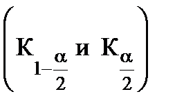 Рис 27. Двусторонняя критическая область В этом случае рассматривают двустороннюю критическую область и используют дифференциальную функцию f (K/H0), для определения соответствующих квантилей (границ области принятия гипотезы - левой (К1-a/2) и правой (Кa/2)). Площадь под криволинейной трапецией дифференциальной функции слева от К1-a/2 и справа от Кa/2 равна a/2. Общая площадь ограниченная криволинейной трапецией дифференциальной функции, квантилями и осью абсцисс равна (1 - α) (рис. 27):