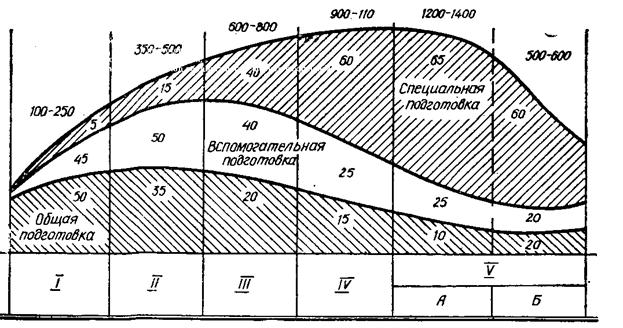 Рисунок 5 – Соотношение основных средств тренировки (%) и годовой объем работы на различных этапах многолетней подготовки: I – этап начальной подготовки; II – этап предварительной базовой подготовки; III – этап специализированной базовой подготовки; IV – этап реализации максимальных достижений; V – этап сохранения достижений (А – период реадаптации; Б - период сохранения результатов)