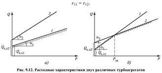 Если на электростанции установлены однотипные турбоагрегаты, то нагрузка между ними распределяется равномерно. Это позволяет задать каждому агрегату достаточно высокую нагрузку. Если агрегаты разнотипны и различаются по мощности и экономичности, то следует произвести оптимальное распределение электрической нагрузки между ними в целях минимизации расхода теплоты в машинном зале в целом. Рассмотрим простейший случай. В турбинном цехе установлены два агрегата различного типа. При этом возможны два основных варианта. I. Нагрузка ТЭС может быть покрыта полностью каждым из двух агрегатов. Расходные характеристики первого и второго турбоагрегатов: Q1=Qх.х1+rт1Р1; Q2=Qх.х2+rт2Р2; 1) если Qх.х1 < Qх.х2 и rт1< rт2, то любая нагрузка ТЭС должна покрываться турбиной No 1, так как это требует меньшего расхода топлива (рис. 9.12, а); rт1=rт2=rт3=...=rтi=... =rтn, где rтi - относительные приросты расхода теплоты по каждой из турбин, т у.т / ГДж.