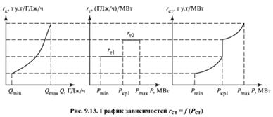 где Эт - удельная выработка электроэнергии на тепловом потреблении, МВт·ч/ГДж. Поэтому для ТЭЦ распределение электрических нагрузок между турбинами заключается в определении целесообразной дополнительной нагрузки конденсационной мощности, которая может меняться: ΔΝ=Рmах - Pmin. Распределение этой конденсационной мощности производится аналогично КЭС, т.е. в порядке возрастания относительных приростов. Если условие параллельной работы не соблюдается и турбины ТЭС включаются последовательно по мере возрастания нагрузки станции, то при распределении нагрузки между ними надо учитывать Загрузка турбоагрегатов производится в последовательности, определяемой возрастанием относительных приростов расхода теплоты по зонам нагрузок. Это позволяет установить рациональную очередность загрузки (разгрузки) совместно работающих турбоагрегатов, обеспечивающую минимальный расход теплоты машинным залом при определенной электрической нагрузке и неизменной тепловой. Характеристика относительных приростов расхода топлива тепловой электростанцией представляет собой зависимость прироста расхода топлива при увеличении электрической нагрузки на единицу (1 МВт·ч) от данной тепловой нагрузки. Основным энергетическим оборудованием электростанций являются котлы и турбоагрегаты. Поэтому характеристика блочной тепловой электростанции зависит от ХОП котлов и турбин и может быть определена по выражению r ст = rкrт. (9.15) Расходы электрической и тепловой энергии на собственные нужды электростанции учитываются внесением поправочных коэффициентов. Относительный прирост расхода топлива является показателем экономичности работы станции или блока. График (вид) зависимости rст = f (Pст) представлен на рис. 9.13. Скачок на ХОП электростанции связан с ХОП турбоагрегата rт, пологовогнутая часть определяется ХОП котла rк. Полученные характеристики тепловых электростанций необходимы для определения расходов топлива тепловыми электростанциями в рассматриваемый период и оптимального режима использования их основных агрегатов.