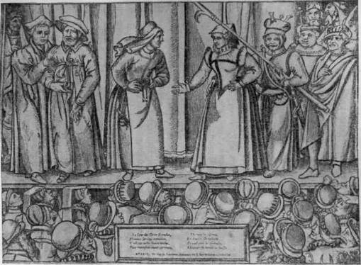 запрещает всем клеркам и служащим, как Парламента, так и Шатле, какого бы положения они ни были, впредь представлять публично в названных Парламенте и Шатле и в каких бы то ни было иных местах фарсы, сотй, моралите и другие игры под страхом изгнания из королевства и конфискации всего их имущества; и если они не испросят дозволения у вы-. шеупомянутого двора, то они будут навсегда лишены своих прав». А в следующем 1477 году прямо было указано «королю» базошских клерков Жану л'Эвелье, что за игру без дозволения он лично будет «исколочен розгами на перекрестках Парижа и изгнан из королевства». Шутовские организации помимо церковно-пародийных сценок сочиняли и разыгрывали всевозможные сатирические эпизоды, из которых создавался новый комедийный жанр сотй (франц. sotie — дурачество). Парижская корпорация Беззаботных ребят задавала в этом отношении тон. Во главе корпорации, по примеру Базоши, стояли выбранные дураки — Князь Дураков и Мать Дуреха. Члены общества одевались в шутовской наряд желто-зеленого цвета, а на головном уборе у них красовались длинные ослиные уши. В сотй дураки выступали в «дурацком» обличий, добавляя к обычному шутовскому костюму некоторые аллегорические атрибуты, символизирующие данный тип. Например, изображая Церковь, дурак набрасывал на себя мантию, а ослиные уши прикрывал папской тиарой. Такое сохранение дурацкого облика имело свое сатирическое значение. Жанр сотй отличался тем, что в нем выступали не бытовые персонажи, а по преимуществу дураки. Например, во французском сотй «Мир и злоупотребления» (1513) выступали Тщеславный дурак — солдат, Дурак-обманщик — клерк-взяточник, Дурак-невежда — простофиля-крестьянин. Абстрактная маска глупости во французском сотй часто приобретала черты бытового и психологического своеобразия. – Танец дураков. XIV в. Принцип типизации в сотй определялся тем же законом аллегорий, что и в моралите. И объяснялось это не простым влиянием старого жанра на новый, а самим характером абстрактных обобщений, присущих средневековому искусству. Давая обобщенную картину действительности, изображая общественные конфликты и сословные типы, сотй пользовалось методом аллегорий. В сотй часто содержались острые, смелые критические выпады, насыщенные изрядной долей народной сатиры. Так, в монологе «Веселая проповедь дураков» у каждой нации и сословия отыскивалась какая-нибудь странность, нелепая черта, умопомешательство. Сумасшедшим представал даже сам римский папа. Единственным средством избавления от глупости объявлялись деньги. Кто без денег, тот дурак, А мудрец — при ком пятак. В этом выводе явственно слышна была злая ирония. Расцвет жанра сотй падает на время царствования Людовика XII, заинтересованного в использовании общественной сатиры для личных и государственных целей. – Фронтиспис «Игры о Принце дураков и Дурацкой матери» П. Гренгуара. 1512 г. Наиболее выдающимся сочинителем сотй был Пьер Грен-гуар — придворный поэт, устроитель театральных зрелищ и один из главных членов общества Беззаботных ребят. По указанию Людовика XII Пьер Гренгуар сочинил «Игру о Принце дураков и Дурацкой матери» (1512), направленную против папы Юлия II, с которым воевал король. Дуреха Мать, олицетворявшая собой католическую церковь, выступала в сообществе с Дурехой Верой и Дураком Случаем. Между ними шла цинич