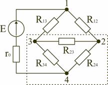 В результате преобразований исходная схема (рис. 1.7) представлена в виде схемы (рис. 1.11) с одним сопротивлением Rэкв. Расчет токов и напряжений для всех элементов схемы можно произвести по законам Ома и Кирхгофа. Соединение элементов электрической цепи по схемам «звезда» и «треугольник» В электротехнических и электронных устройствах элементы цепи соединяются по мостовой схеме (рис. 1.12). Сопротивления R12, R13, R24, R34 включены в плечи моста, в диагональ 1–4 включен источник питания с ЭДС Е, другая диагональ 3–4 называется измерительной диагональю моста.