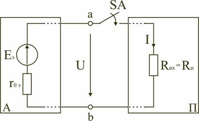 При подключении к источнику питания различного количества потребителей или изменения их параметров будут изменяться величины напряжений, токов и мощностей в электрической цепи, от значений которых зависит режим работы цепи и ее элементов. Реальная электрическая цепь может быть представлена в виде активного и пассивного двухполюсников (рис. 1.23).