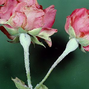 Ржавчина (Phragmidium spec.) на бутонах розы Возбудитель — ржавчинный гриб Phragmidium disciflorum (Tode) Jaes.[4] Грибы развиваются на надземных частях растений, питаются содержимым только живых клеток, распространяются спорами. У больных растений нарушаются обмен веществ, водный баланс, снижается энергия фотосинтеза[6].