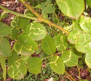 Вирус полосатости розы — Rose streak virus. Симптомы: на молодых листьях появляются коричневые кольца и крапчатые окаймления жилок, на побегах — расплывчатые разводы и пятна зеленовато-коричневого цвета. Пораженные растения отстают в росте и слабо цветут. Меры борьбы: пораженные листья и побеги обрезают и сжигают. При сильном поражении растения выкапывают и сжигают[4]. Во время и после обрезки садовый инвентарь дезинфицируют в спирте или 1 % растворе марганцовки.