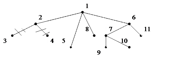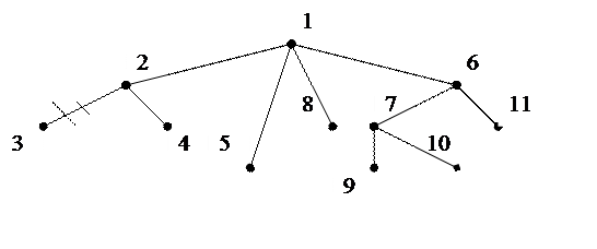 Запишем список всех вершин в порядке возрастания номеров: {1, 2, 3, 4, 5, 6, 7, 8, 9, 10, 11}. Рассматривая список слева направо, находим первую висячую вершину. В нашем случае это вершина № 3. Определяем номер смежной с ней вершины (№ 2) и записываем его в новый список. При этом номер висячей вершины «удаляем» из первоначального списка: список 2: {2, …},