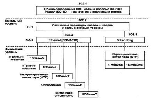 Цель лекции: изучить стандарты локально-вычислительных сетей. Протоколы технологии Ethernet. Локальной вычислительной сетью принято называть сеть, все элементы которой располагаются на сравнительно небольшой территории. Такая сеть обычно предназначена для сбора, передачи и распределённой обработки информации в пределах одного предприятия или организации. Структура ЛВС отражает в определённых пределах структуру обслуживаемой организации, а поэтому часто имеет иерархическое построение. В ЛВС применяется прямая передача дискретной информации, при которой цифровые сигналы, без модуляции несущей частоты (используемой для широкополосной передачи по телефонным линиям) поступают в физический канал (соединительный кабель). За основу архитектуры ЛВС принята эталонная модель ВОС. Работа ЛВС описывается на первых двух уровнях модели ВОС – физическом и канальном. Существуют три основных вида топологий: "шина", "звезда" и "кольцо". Ethernet - это самый распространенный на сегодняшний день стандарт локальных сетей. Стандарты IEEE 802 имеют достаточно четкую структуру, приведенную на рисунке 2.1.