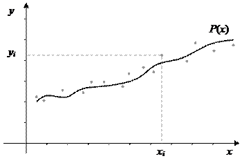 Рис. 2.5.1 – Аппроксимация МНК Если требуется построить такой полином, чтобы он проходил через все точки (xi, yi), то его называют интерполирующим (от англ. interpolate). Здесь приставка «inter-» имеет смысл «между». Т.е. нас интересует поведение полинома только между точками (xi, yi), т.е. между границами отрезка [а, b]. А критерий близости интерполирующего полинома к исходной функции выглядит как yi = P(xi). (2.5.4) При этом обычно x0 = a, xn = b. Для того же набора точек, что и на рисунке выше, получим следующее: