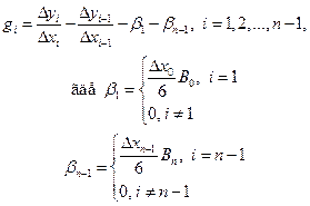 M = (M1, M2, …, Mn–1). Для кубического сплайна можно выбрать любой тип граничных условий (либо по первой, либо по второй производной). Соответственно, во входном файле будут находиться значения первой (A0 и An) или второй (B0 и Bn) производной в первой и последней точке отрезка. Если граничные условия заданы по второй производной, то M0 = B0, Mn = Bn, а остальные неизвестные Mi находятся решением СЛАУ (2.6.12). Если граничные условия заданы по первой производной, то b0 = A0, bn = An. Тогда к системе можно добавить еще два уравнения, используя (2.6.10) при i = 0 и (2.6.11) при i = n, а также перенести в левую часть СЛАУ слагаемые с неизвестными коэффициентами из выражений для g1 и gn–1. Получим модифицированную СЛАУ