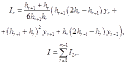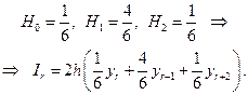 Для повышения точности интегрирования можно использовать полиномы более высокого порядка. Так, для p = 2 получаем формулу Симпсона. Полином (парабола) строится по трем точкам, поэтому имеет значение, равномерная сетка или нет. Отрезки для интегрирования берутся парами, поэтому количество интервалов интегрирования должно быть четным (т.е. n = 2m, m = 1, 2, …). Интегрируя (2.7.10), получаем