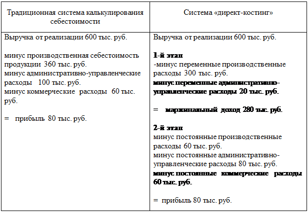 Таблица 4.2 Сравнительная характеристика результатов учета затрат и калькулирования себестоимости по системе «директ-костинг» и по традиционной системе