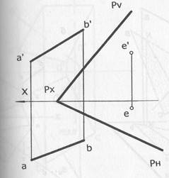 Упражнение 5. Задача 1. Через точку Е проведите два отрезка прямых, параллельных плоскости Р; отрезок ЕС общего положения произвольной длины и отрезок ЕМ произвольной длины, параллельный профильной плоскости проекций. Определите, параллелен или нет отрезок АВ в плоскости Р.