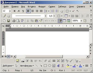 Подобно всем остальным приложениям из пакета Microsoft Office, в текстовом процессоре Word предусмотрена система текстовых меню и дублирующая её система графических меню. Графические меню удобно использовать, но они занимают много места на экране, поэтому в графическое меню обычно помещают только часто используемые команды. Ниже показано окно текстового процессора: