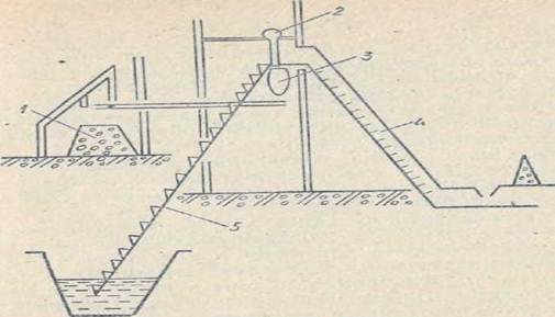 3 -готовая продукция; 2- линия подачи фосфоритной муки; 3 -смеситель; 4 -линия подачи торфа; 5 -линия подачи навоза Рисунок 35 - Производство компостов