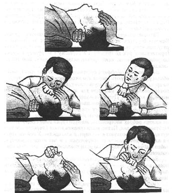 Першу допомогу потопаючим надають так: спочатку видаляють воду з дихальних шляхів, для чого треба покласти потерпілого грудьми собі на коліно так, щоб голова висіла вниз, і натискувати на грудну клітину долонями, що сприяє швидкому видаленню води. Якщо в роті є слиз, блювотні маси, пісок, вставні зуби, потрібно обгорнути носовою хустинкою пальці і очистити порожнину рота. Коли вода перестає виділятися з рота і носа, потерпілого кладуть на спину, підклавши спочатку валик з одягу під поперек, і починають робити штучне дихання до появи ознак життя, а іноді це роблять протягом 3-4 годин. Штучне дихання. Перш ніж починати штучне дихання, потрібно усунути все, що заважає нормальному диханню. Ніс і рот потерпілого очищають, штучні зуби (протези) виймають. Голову обов'язково треба повернути на бік, щоб блювотні маси не потрапили в дихальні шляхи. Штучне дихання проводять різними способами: за Лабордом, Сильвестром, Шеффером і Шюллером. За способом Лабордавитягують язик потерпілого і притримують пальцями, обмотаними носовою хустинкою або марлею. Захвачують язик, витягують його (при цьому відбувається вдих) і потім, не випускаючи, дають йому податися в рот (при цьому відбувається видих). Робити це потрібно ритмічно 12-16 разів за хвилину. У такому ж темпі робиться «вдих» і «видих» і при інших способах штучного дихання, що приблизно відповідає кількості дихальних рухів у здорової людини. Якщо щелепи потерпілого стулені, то палець вводять у простір за зубами, між щокою і останнім корінним зубом, обережно розщеплюють щелепи, щоб вони знову не зчепилися; у щілину, що утворилася, вставляють обмотану хустинкою ручку металевої ложки чи олівець. За способом Сильвестра потерпілого кладуть на спину, під лопатки підкладають валик з одягу. Той, хто робить штучне дихання, стає на коліна біля голови потерпілого, бере його руки за передпліччя біля ліктів. Вдих відтворюється відведенням рук у боки і назад за голову на кілька секунд (2 - 3), а видих досягається приведенням зігнутих у ліктях рук до боків грудної клітини. Руки потерпілого притискують при цьому до грудної клітини, в результаті чого із неї витискається повітря. Штучне дихання за Сильвестром краще проводити удвох. Кожний береться за одну руку потерпілого і діє за повільним рахунком «раз, два, три» (закидання рук за голову), «чотири, п'ять» (притискання рук до грудей). І в першому і в другому випадку потрібний помічник, який тримає витягнутий язик, щоб він не западав. За способом Шеффера потерпілого кладуть на живіт, потім обидві руки витягують вперед або витягують вперед одну руку, а на другу, зігнуту у лікті, кладуть голову, повернуту на бік. Той, хто подає допомогу, стає на коліна так, щоб стегна потерпілого були між його колінами. Потім він кладе великі пальці по боках хребта, нижче лопаток, а рештою пальців охоплює нижню частину грудної клітини. При рахунку «раз, два, три» потрібно повільно потягнутися вперед, масу свого тіла передати рукам, які лежать на нижніх ребрах потерпілого, від чого груди його стискаються і відбувається видих. Потім, відкинувшись назад і переставши тиснути, потрібно порахувати: «чотири, п'ять, шість». У цей час грудна клітина потерпілого розширюється і в неї входить повітря, тобто відбувається вдих. Такі рухи повторюють до настання природного дихання. За способом Шюллера потерпі