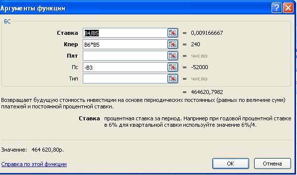 Для нашей задачи функция БС примет вид: БС(11%/12;20*12;;-52000)