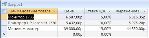 3. Сохраните запрос под именем Пример 2. Для решения этой задачи необходимо создать запрос с вычисляемым полем. Вычисляемые поля в запросах позволяют получить новое поле с результатами вычисления, отображаемыми только в таблице запроса, и не создает полей в исходных таблицах базы данных. 1. Создайте в режиме конструктора запрос на выборку для таблицы Товар. В запрос включите поля Наименование товара, Цена, ставка НДС. 2. Для подсчета цен с учетом НДС создайте вычисляемое поле, записав выражение [Цена]+[Цена]*[Ставка НДС] 3. Для отбора записей с ценой выше 5000 в вычисляемое поле в строку Условие отбора введите >5000