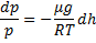 До сих пор рассматривалось поведение идеального газа, не подверженного воздействию внешних силовых полей. Из опыта хорошо известно, что при действии внешних сил равномерное распространение частиц в пространстве может нарушиться. Так под действием силы тяжести молекулы стремятся опуститься на дно сосуда. Интенсивное тепловое движение препятствует осаждению, и молекулы распространяются так, что их концентрация постепенно уменьшается по мере увеличения высоты. Выведем закон изменения давления с высотой предполагая, что поле тяготения однородно, температура постоянна и масса всех молекул одинакова. Если атмосферное давление на высоте h равно p, то на высоте h + dh оно равно p + dp (при dh > 0, dp < 0, так как p уменьшается с увеличением h).