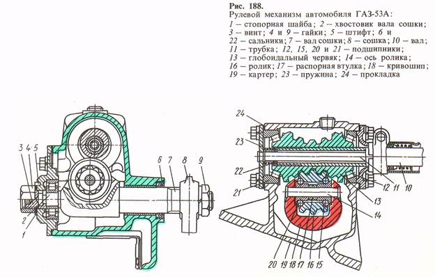 Комбіновані (ЗІЛ, МАЗ, КамАЗ). Зубчасті та кривошипні рульові механізми на даний час не використовуються. Заправочні об'єми: ГАЗ-24.10 - 0,3 л. ТАП-15В. Передат. число U = 19,3 ГАЗ-53.12 - 0,5 л. ТАП-15В. Передат. число U = 19,5 МАЗ-5335 - 1,2 л. ТСп-15К. Передат. число U = 23,6 ЗІЛ-130, КамАЗ-5320 - 3,2 л. ("Р") рульове U = 20. 2) Будова РМ ГАЗ-53.12 Черв'ячний, з глобоїдальним черв'яком і трьохгребневим роликом. 1. Рульове колесо. 2. Вал рульового колеса. 3. Картер РМ. 4. Глобоїдальний черв'як. 5. Підшипники черв'яка (роликові). 6. Трьохгребневий ролик. 7. Підшипники ролика (гольчасті) з розпірною втулкою. 8. Вісь ролика. 9. Вал сошки з вилкою.