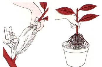 Рис. 20. Розмноження повітряними відсадками: а – готування пагона; б – огортання пагона субстратом; в – обв’язування плівкою; г – відділення пагона від гілки після утворення коренів; д – дорощування повітряних відсадків.
