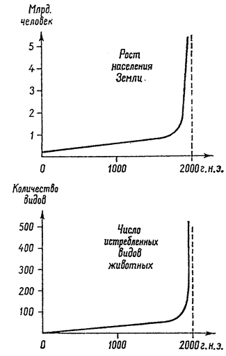 Рис. 17.8. Связь между увеличением численнос населения Земли и числом уничтоженных видов животных