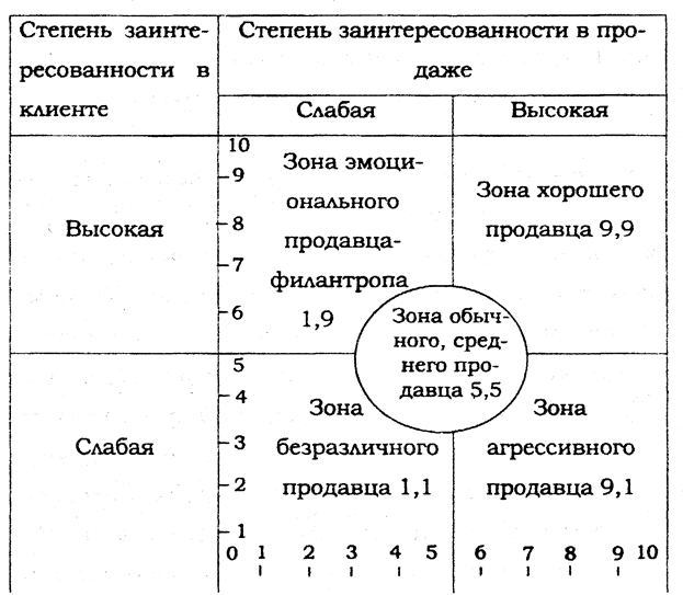 Результативность встречи продавца и покупателя предопределена степенью заинтересованности первого в продаже, а второго - в покупке. Заинтересованность продавца в продаже можно описать сеткой продавца (рис. 2.12). В зависимости от сочетания степени заинтересованности в продаже (от слабой до высокой) и степени заинтересованности в клиенте (также от слабой до высокой), выстраиваемых на шкале оценок до 0 до 10, получим: - зону эмоционального продавца филантротопа в системе координат слабая/высокая с крайними значениями 1,9, т.е. степень заинтересованности в продаже равна 1, а степень заинтересованности в клиенте - 9; - зону хорошего продавца в системе координат выкая/высокая с крайними значениями 9,9; - зону обычного, среднего продавца со значениями 5,5; - зону безразличного продавца в системе координат слабая/слабая с крайними значениями 1,1; - зону агрессивного продавца в системе координат высокая/слабая с крайними значениями оцениваемых параметров 9,1.