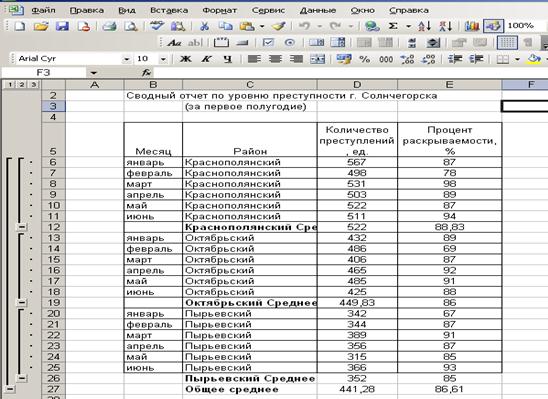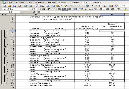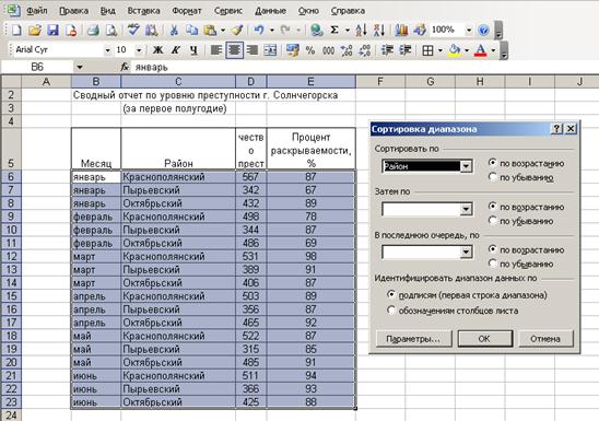 Рис. 13. Определение средних значений показателей за каждый месяц первого полугодия. Обязательным условием здесь является упорядочение данных по ключевому столбцу, то есть по месяцу. Если же подвести итоги надо по районам, то первой должна быть операция сортировки таблицы по столбцу Район. Пример 9. Определить средний уровень преступность и процент раскрываемости за первое полугодие по каждому району. Для этого реализуем следующую последовательность действий: 1. Сортировать таблицу по столбцу Район: a. Выделить таблицу с «шапкой»; b. Команда: ДАННЫЕ – СОРТИРОВКА; c. В появившемся окне выставить параметры сортировки (рис. 14); d. ОК (рис.15); 2. Для подведения итогов выделить таблицу, включая «шапку»; 3. Команда: ДАННЫЕ – ИТОГИ (рис. 16); 4. Определить параметры подведения итогов: e. При каждом изменении в: Район; f. Операция: Среднее; g. Добавить итоги по: Количество преступлений, ед.; Процент раскрываемости, %; 5. ОК. Развернутый и краткий результата подведения итогов отображен на рис. 17 – 18.