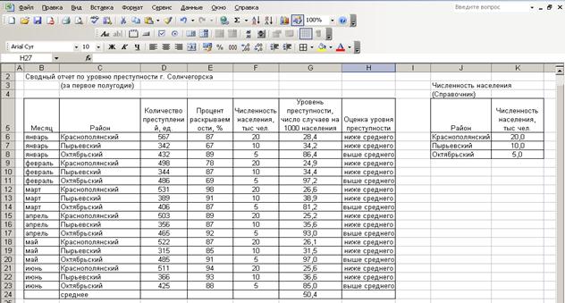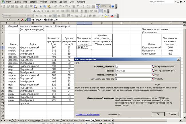 Рис. 18. Краткие результаты подведения Промежуточных итогов по полю Район. Анализируя результаты итоговой таблицы (рис.18), можно сделать вывод, что наиболее высокий уровень преступности в Краснополянском районе, но здесь наблюдается и наилучший процент раскрываемости преступлений. Данные Пырьевского района близки к средним по городу. В Октябрьском районе уровень преступности ниже, но и хуже раскрываемость преступлений. Поиск информации в таблицах будет рассмотрен на примере использования функции ВПР(…) и фильтрации данных. Пример 10. Используя дополнительные сведения о численности населения в районе (рис.19), рассчитать показатель районного уровня преступности «Количество преступлений, число случаев на 1000 населения». Дополнительные сведения о численности населения в районе оформлены в виде таблицы-справочника в диапазоне ячеек J6:K8. Выбор численности населения из справочника с помощью функции ВПР(…) осуществляется следующим образом (рис. 19). 1. Курсор поместить в ячейку результата – F6; 2. Открыть окно мастера функций; 3. Выбрать категорию Ссылки и массивы; 4. Выбрать функцию ВПР(…), ввести параметры: a. В поле Значение указать адрес ячейки, содержащей ключевое значение поиска - C6; b. В поле Таблица указать диапазон ячеек, содержащих справочник - J6:K8; c. В поле Номер_столбца ввести число, соответствующее номеру столбца таблицы-справочника, содержащей искомую информацию – 2; d. В поле Интервальный_просмотр для точного поиска информациивводится 0. 5. ОК. Для копирования функции =ВПР(C6;$J$6:$K$8;2;0) по столбцу, необходимо диапазону таблицы-справочника назначить абсолютную адресацию.