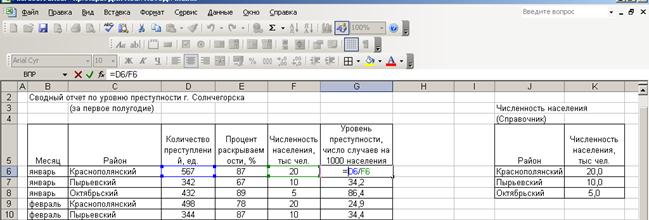Рис. 19. Пример ввода функции =ВПР(…). Уровень преступности (число преступлений на 1000 населения) определяется по формуле: =D6/F6 (рис. 20).