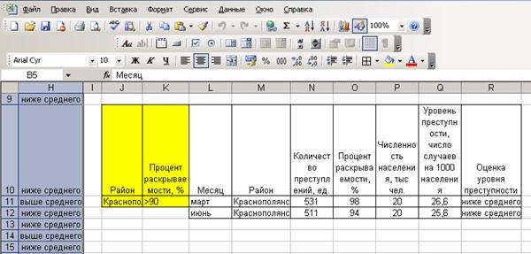 Рис. 25. Результаты автофильтрации по заданным двум критериям. Таким образом, наиболее криминогенная ситуация наблюдалась в Октябрьском районе в феврале. Пример 13. С помощью расширенного фильтра сформировать отдельные таблицы (выходные документы) по каждому району, позволяющие определить месяцы наилучшей раскрываемости преступлений (Процент раскрываемости > 90%). Этапы реализации задачи: 1. Сформировать таблицу критериев – ячейки J10:K11; 2. Выделить таблицу, включая «шапку», но без итоговых строк; 3. Команда: ДАННЫЕ – ФИЛЬТР – РАСШИРЕННЫЙ ФИЛЬТР; 4. Ввести параметры (рис. 26): a. Обработка – Скопировать результат в другое место; b. Исходный диапазон - $B$5:$H$24; c. Диапазон условий - $J$10:$K$11; d. Поместить результат в диапазон - $L$10 (указывается левая верхняя ячейка таблицы, содержащая в будущем выходную информацию); 5. ОК