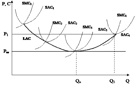 Рис. 6.12. Кривая долгосрочных издержек фирмы и выбор оптимального объема производства в долгосрочном периоде. В приведенном на рисунке примере линия рыночной цены Рm коснулась точки минимума долгосрочных средних издержек фирмы, это и есть точка оптимального объема производства фирмы в долгосрочном периоде. Конечно, цена товара может быть и выше, скажем Р1, пересекая кривые предельных издержек SMC2 и SMC4, в этом случае оптимальная производственная мощность фирмы, на первый взгляд, будет больше – Q1. Однако в этом случае вступит в силу отраслевое взаимодействие фирм – вместо того, чтобы в рамках одного крупного предприятия организовывать производство товара в размере Q1, можно будет организовать два или более мелких предприятий, имеющих мощности Qo, с более низкими средними издержками производства. Такие предприятия смогут назначать более низкую цену и успешнее конкурировать. Цена на рынке совершенной конкуренции упадет до Pm, что соответствует самой дешевой технологии производства для фирм. Далее об этом будет сказано в подразделе 6.5 данной главы. Таким образом, оптимальный объем производства фирмы в долгосрочном периоде наблюдается при равенстве предельных издержек, долгосрочных средних издержек, предельных доходов и цены товара. В долгосрочном периоде фирма не получает ни убытков, ни экономической прибыли, получая лишь нормальную прибыль.