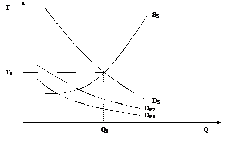 Учитывая, что общественные товары неисключаемы, совокупный спрос на общественный товар (DS) формируется путем суммирования налоговых поступлений от каждого потребителя за данный товар, то есть сложения кривых индивидуального спроса по вертикали (DP1+DP2 на рис. 19.4). В то же время, кривая совокупного предложения общественных товаров представляет сочетание издержек общества при отказе от частных товаров, то есть более высокая ставка налогообложения приводит к более высоким предельным издержкам на производство общественных товаров.