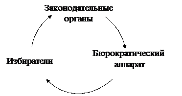 Политические процессы не ограничиваются одним взаимодействием избирателей и избранных ими представителей. Реальная деятельность правительства на всех уровнях выполняется множеством подчиненных ему органов: департаментов, агентств и учреждений. Поэтому одним из направлений исследования теории общественного выбора является экономика бюрократии. Изучению проблем в данной области посвящены работы В. Нисканена, А. Бретона, Г. Таллока и других экономистов. Экономика бюрократии представляет собой систему организаций, удовлетворяющую как минимум двум критериям: во-первых, она не производит экономические блага, имеющие ценностную оценку, и, во-вторых, часть своих доходов она извлекает из источников, не связанных с продажей результатов своей деятельности. Бюрократия является неотъемлемой частью современного государства. Законодательные органы участвуют в формировании исполнительного аппарата с широким кругом крупных и мелких ведомств и организаций, целью которых является выполнение функций государства и защита интересов избирателей. Избрание законодателей осуществляется непосредственно гражданами, которые в свою очередь находятся в прямом подчинении у бюрократического аппарата. Возникает круговое взаимодействие избирателей, законодательного аппарата и бюрократии (рис. 21.6).