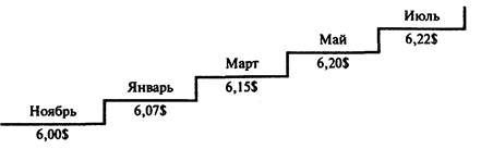 Рынок, на котором цена на наличный товар (цена ближайшего на данный момент контракта) ниже, чем цена на срок (цена отдаленного во времени контракта), называется нормальным рынкам (normal, carrying charge market). Разница между ценами представляет собой накладные расходы, поэтому термины " нормальный рынок" и "рынок накладных расходов" практически равнозначны. На рынке полных накладных расходов разница между ценами двух фьючерсных контрактов отражает по крайней мере полную (совокупную) стоимость хранения. Так, на рис.9.7 показана структура фьючерсных цен ни рынке кукурузы, где издержки составляют около 7,25 центов в месяц.