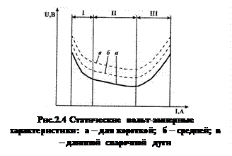 Общее напряжение сварочной дуги, соответственно, слагается из суммы падений напряжений в отдельных областях дуги Одной из основных характеристик электрического дугового разряда является статическая вольт-амперная характеристика - зависимость напряжения дуги при постоянной ее длине от силы тока в ней (рис.2.4). С увеличением длины дуги напряжение увеличивается и кривая статической вольтамперной характеристики дуги поднимается выше, примерно сохраняя при этом свою форму (кривые, а, б, в). На ней различают три области: падающую I, жесткую (почти горизонтальную) II и возрастающую III. В зависимости от условий горения дуги ей соответствует один из участков характеристики. При ручной дуговой сварке покрытыми электродами, сварке в защитных газах неплавящимся электродом и сварке под флюсом на сравнительно небольших плотностях тока характеристика дуги будет вначале падающей, а при увеличении тока полностью перейдет в жесткую. При этом с увеличением сварочного тока пропорционально увеличиваются поперечное сечение столба дуги и площади поперечного сечения анодного и катодного пятен. Плотность тока и напряжение дуги остаются постоянными. При сварке под флюсом и в защитных газах тонкой электродной проволокой на больших плотностях тока характеристика дуги становится возрастающей. Это объясняется тем, что диаметры катодного и анодного пятен становятся равными диаметру электрода и больше увеличиваться не могут. В дуговом промежутке наступает полная ионизация газовых молекул и дальнейшее увеличение сварочного тока может происходить лишь за счет увеличения скорости движения электронов и ионов, т. е. за счет увеличения напряженности электрического поля. Поэтому для дальнейшего увеличения сварочного тока требуется увеличение напряжения дуги. Сварочная дуга представляет собой мощный концентрированный источник теплоты. Почти вся электрическая энергия, потребляемая дугой, превращается в тепловую. Полная тепловая мощность дуги Q=IсвUд (Дж/с) зависит от силы сварочного тока Iсв (А) и напряжения дуги Uд (В). Следует отметить, что не вся теплота дуги затрачивается на нагрев и плавление металла. Часть её бесполезно расходуется на нагрев окружающего воздуха или защитного газа, радиационное излучение и т.д. В связи с этим эффективная тепловая мощность дуги qэф (Дж/с) (та часть теплоты сварочной дуги, которая вводится непосредственно в изделие) определяется следующим соотношением: Коэффициент η зависит от способа сварки, материала электрода, состава покрытия или флюса и ряда других факторов. Например, при сварке открытой дугой угольным или вольфрамовых электродом он составляет в среднем 0,6; при сварке покрытыми (качественными) электродами - около 0,75; при сварке под флюсом - 0,8 и более.