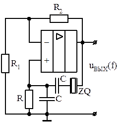На рис. 10.4 б изображена упрошенная схема RС -генератора с мостом Вина, в котором вместо одного из резисторов включен кварцевый резонатор, работающий в режиме резонанса напряжений.