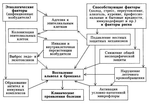 Имеется также эндогенный механизм развития воспаления в легочной ткани, обусловленный активацией микрофлоры, находящейся в легких. Роль его велика особенно при внутрибольничных П. Начальным звеном развития воспаления легких является (схема 3) адгезия микроорганизмов к поверхности эпителиальных клеток бронхиального дерева, чему значительно способствуют предшествующая дисфункция реснитчатого мерцательного эпителия и нарушение мукоцилиар-ного клиренса. Следующим после адгезии этапом развития воспаления является колонизация микроорганизма в эпителиальных клетках. Повреждение мембраны этих клеток способствует интенсивной выработке биологически активных веществ-цитокинов (интерлейкинов 1,8, 12 и др.). Под влиянием цитокинов осуществляется хемотаксис макрофагов, нейтрофилов и других эффекторных клеток, принимающих участие в местной воспалительной реакции. В развитии последующих этапов воспаления существенную роль играют инвазия и внутриклеточная персистен-ция микроорганизмов, выработка ими эндо- и экзотоксинов. Эти процессы приводят к воспалению альвеол и бронхиол и развитию клинических проявлений заболевания. Важную роль в развитии П играют факторы риска. К ним относят возраст (пожилые люди и дети); курение; хронические заболевания легких, сердца, почек, желудочно-кишечного тракта; иммунодефицитные состояния; контакт с птицами, грызунами и другими животными; путешествия (поезда, вокзалы, самолеты, гостиницы); охлаждение; формирование замкнутых коллективов. Кроме инфекции, развитию пневмоний могут способствовать неблагоприятные факторы внешней и внутренней среды, под влиянием которых происходят снижение общей неспецифической резистентности организма (подавление фагоцитоза, выработка бактериолизинов и пр.) и подавление местных защитных механизмов (нарушение мукоцилиарного клиренса, снижение фагоцитарной активности альвеолярных макрофагов и нейтро-филов и др.). В патогенезе П определенное значение придается аллергическим и ау-тоаллергическим реакциям. Сапрофиты и патогенные микроорганизмы, становясь антигенами, способствуют выработке антител, которые фиксируются преимущественно на клетках слизистой оболочки дыхательных путей. Здесь происходит реакция антиген —антитело, которая приводит к повреждению тканей и развитию воспалительного процесса. При наличии общих антигенных детерминант микроорганизмов и легочной ткани или при повреждении легочной ткани вирусами, микроорганизмами, токсинами, приводящем к проявлению ее антигенных свойств, развиваются аутоаллергические процессы. Эти процессы способствуют более длительному существованию патологических изменений и затяжному течению болезни. Кроме этого, затяжное течение П часто бывает обусловлено наличием ассоциаций микроорганизмов. Клиническая картина. Для проявления П характерны следующие основные синдромы: • Интоксикационный (общая слабость, разбитость, головные и мы • Синдром общих воспалительных изменений (чувство жара, озноб, • Синдром воспалительных изменений легочной ткани (появление • Синдром вовлечения других органов и систем (сердечно-сосудистой Степень выраженности этих проявлений характеризует тяжесть течения пневмонии (табл. 1). Клиническая картина П зависит от ряда причин и во многом определяется характером возбудителя и 