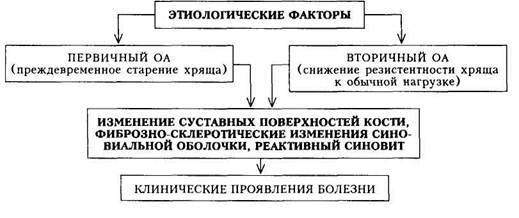 Остеоартроз (ОА) — дистрофическое заболевание суставов, конечностей и позвоночника, в основе которого лежит прогрессирующая дегенерация суставного хряща вплоть до его полного уничтожения, сопровождающаяся разрастаниями краевых поверхностей суставных костей и вторичным синовитом. Дегенерация суставного хряща является нормальным физиологическим процессом и после 60 лет отмечается в 100 % случаев. Этапы возрастной дегенерации хрящевой ткани: 1) уменьшение содержания хондроитинсульфата, что приводит к из 2) замещение основного вещества хряща соединительной тканью 3) потеря эластичности и упругости хряща; 4) разволокнение хрящевой ткани, появление изъязвлений с обнаже При ОА происходит подобная, только более ранняя и быстрая дегенерация хряща, сопровождающаяся изменениями окружающих тканей. Этиология. Различают первичный и вторичный ОА. Первичный ОА — развитие преждевременного старения хряща суставов, ранее не поврежденных патологическим процессом. Вторичный О А — поражение хряща суставов, ранее подвергавшихся патологическим воздействиям. При первичном ОА имеют значение следующие факторы: 1) генетический (в семьях, где имеются больные ОА, это заболевание встречается в 2 раза чаще, чем в контрольной группе); 2) эндокринный (в климактерическом периоде О А развивается более быстрыми темпами); 3) постоянная микротравматизация сустава неадекватными физическими нагрузками (в частности, спортивными). При вторичном ОА отмечается снижение резистентности хряща к обычной (физиологической) нагрузке вследствие: 1) травм хряща; 2) врожденных нарушений статики; 3) слабости мышц и связок; 4) бывших ранее артритов; 5) нарушений конгруэнтности суставных поверхностей. Патогенез. При ОА все этапы возрастной дегенерации хряща протекают быстрее и в более молодом возрасте. В патогенезе клинических проявлений ОА играют роль три фактора: 1) изменение суставных поверхностей кости; 2) фиброзно-склеротические изменения синовиальной оболочки; 3) реактивный синовит. Основное вещество хряща, покрывающего суставную поверхность хряща (кислые и нейтральные мукополисахариды), перерождается, местами исчезает, замещаясь плотной соединительной тканью. Хондроциты гибнут, хрящ становится тусклым, сухим, теряет эластичность, может растрескиваться и изъязвляться с обнажением подлежащей кости. Однако этот процесс нетождественен эрозивному артриту при РА, при котором разрушение хряща осуществляется рыхлой соединительной тканью — паннусом. Субхондрально развивается остеосклероз, на периферии суставных поверхностей возникают разрастания кости — остеофиты. Фиброзно-склеротические изменения захватывают капсулу сустава и синовиальную оболочку. Возникают также фиброзные изменения связочного аппарата с их кальцинацией, что обусловливает подвывихи сустава. Реактивный синовит (воспаление синовиальной оболочки) возникает вследствие раздражения внутрисуставным детритом — кусочками некро-тизированного хряща. Иногда отмечается гипертрофия ворсин синовиальной оболочки с хрящевой или костной метаплазией, отрыв таких измененных ворсин ведет к появлению суставных «мышей». Патогенез О А представлен на схеме 32. Клиническая картина. ОА встречается преимущественно у женщин 40 — 60 лет. Основным проявлением является суставной синдром. Выделяют следующие основны