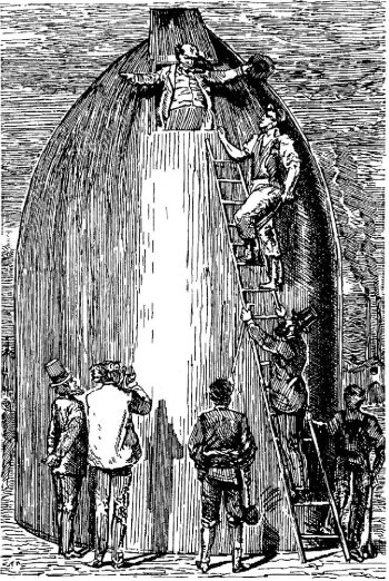 Рис. 1.14. «Через несколько мгновений из люка на верхушке конуса с торжествующим видом появился секретарь „Пушечного клуба“. За время „опыта“ он еще больше растолстел». Недельный эксперимент по пребыванию в герметически закрытом снаряде «Колумбиады» прошел успешно. Вскоре герои Жюля Верна отправились в этом снаряде к Луне; «…нужен был смелый гений американцев, чтобы возникла мысль о завоевании нашего спутника». (Иллюстрация Henri de Montaut к изданию 1868 г.)