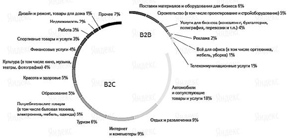 Подойдет ли контекстная реклама для вашего бизнеса? Сравните его с бизнесами, которые уже успешно рекламируются с помощью контекста. Исследования аудитории покупателей контекстной рекламы (рекламодателей) проводятся каждый год, поэтому логично предложить читателям самостоятельно найти свежие данные. Обычно их публикуют сервисы контекстной рекламы, потому что обладают максимумом информации по этому вопросу. Адрес исследования Яндекса «Контекстная реклама в России. Осень 2010 года» есть в «Полезных ссылках» к данной главе. На рис. 4 показано распределение показов объявлений сервиса контекстной рекламы Яндекс.Директ по тематикам, данные приведены на лето 2010 г. Примерно 80 % всех показов приходится на рекламу товаров и услуг для личного потребления (сегмент B2C – business to consumer, бизнес – людям). Оставшиеся 20 % – реклама продуктов для бизнеса (сегмент B2B – business to business, бизнес – бизнесу).